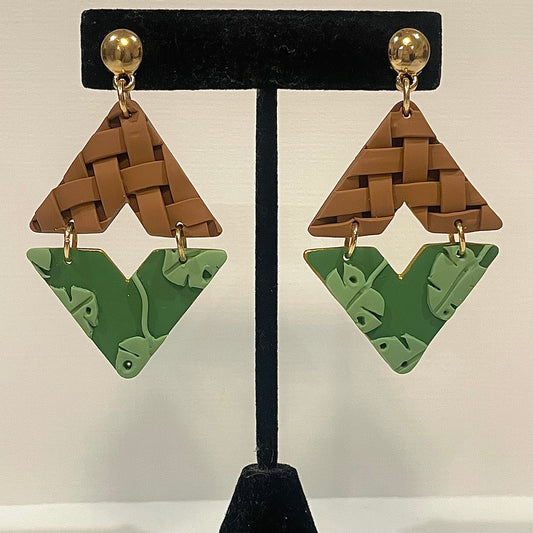 Monstera Leaf and Woven Basket Double V Dangle Earrings