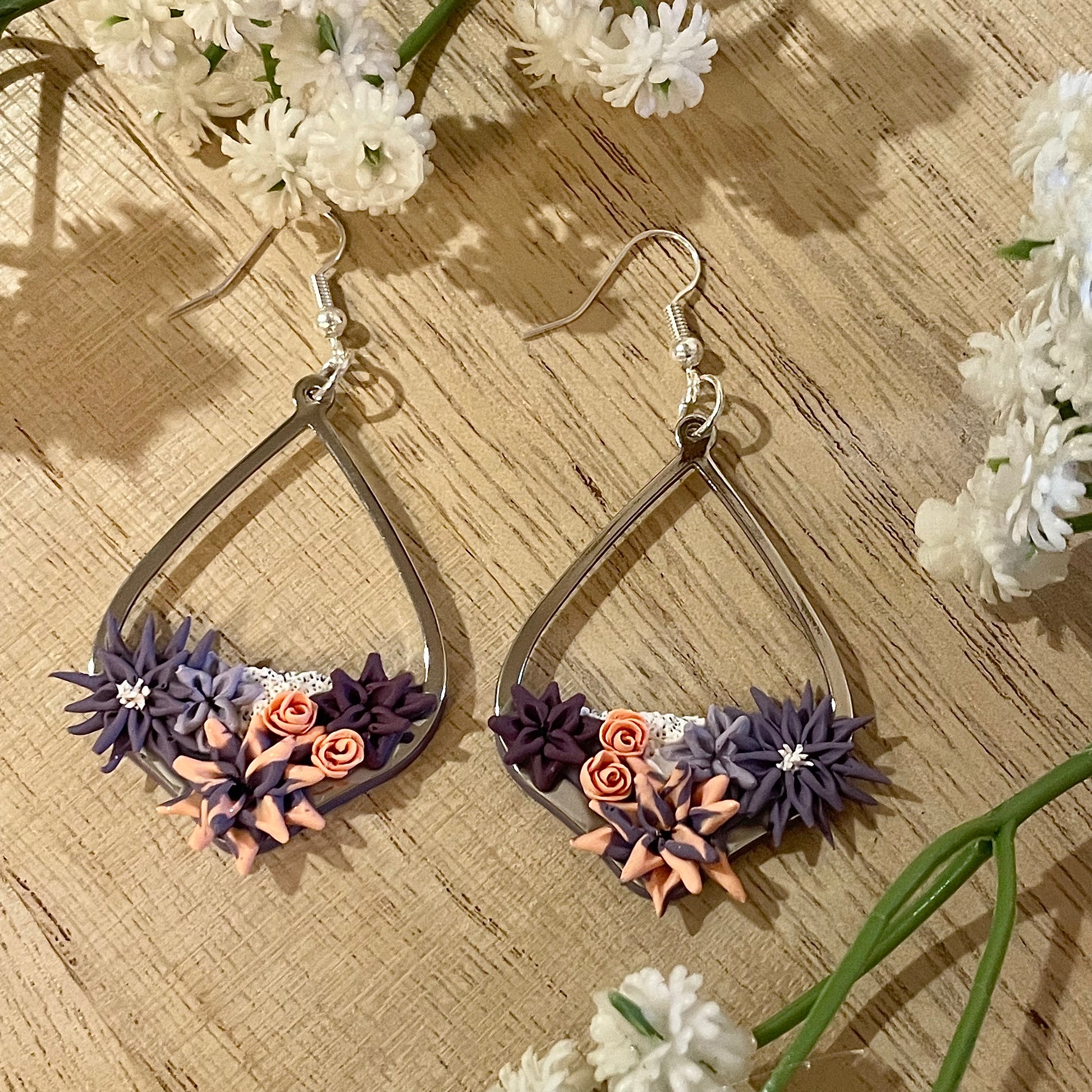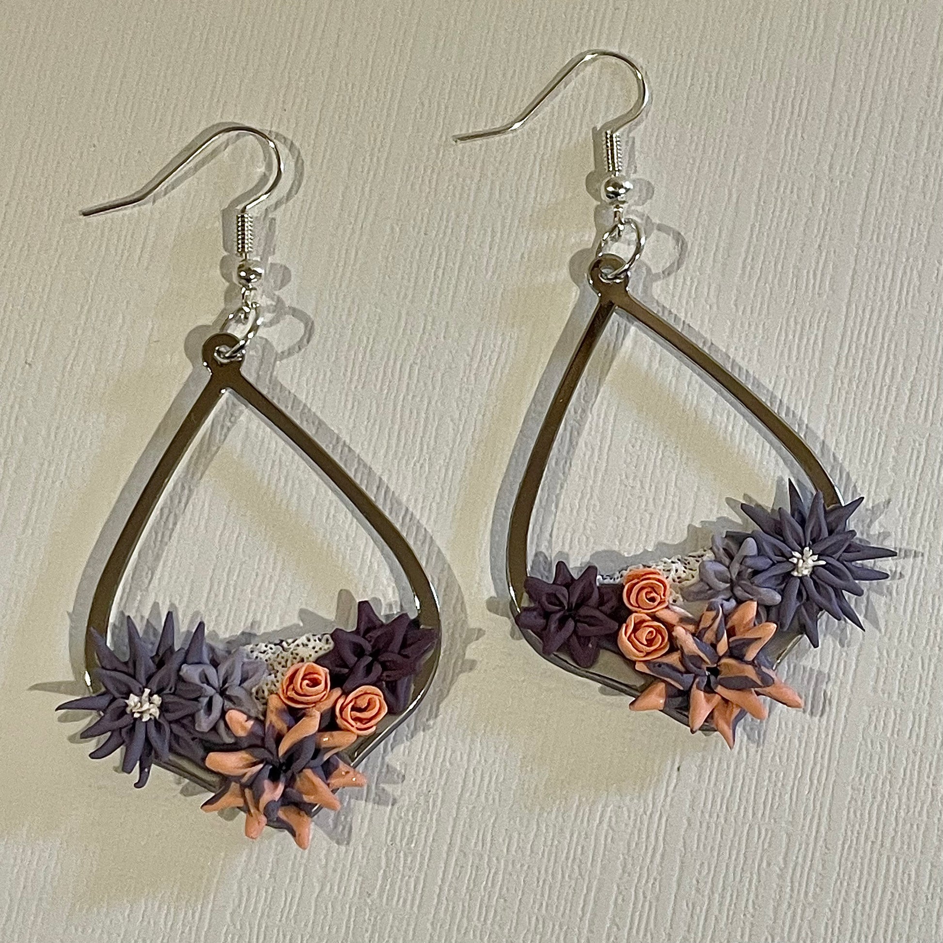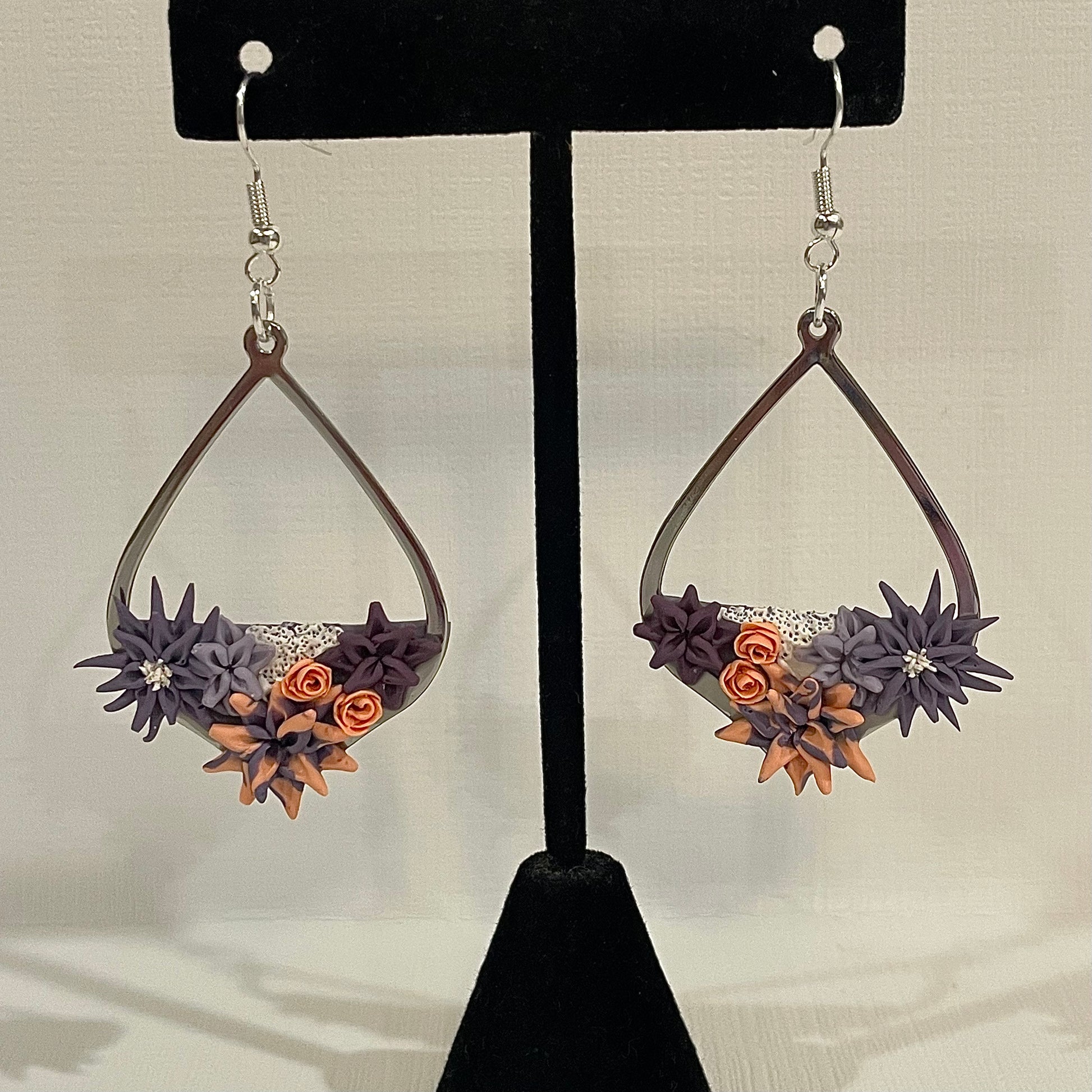 Graceful but bold, these lightweight clay earrings will bring down the house at any spring brunch. With a purple and orange color scheme, there are four succulents in various shades of purple ranging from light to dark and including a purple to orange ombré succulent. There are also two orange roses and sparkly white accents like in the middle of the medium purple succulent and a bit of moss under the light purple one. Everything is fixed onto a silver, teardrop shaped metal fixture.